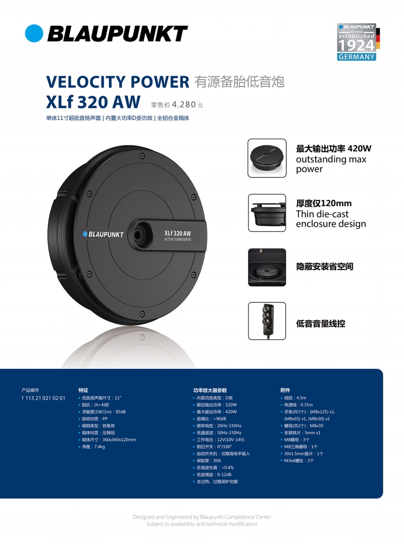 藍(lán)寶XLf 320 AW有源備胎炮擁有高達(dá)420W最大功率和大尺寸磁鐵為低頻提供過(guò)硬的傳輸基礎(chǔ),內(nèi)置D類(lèi)放大器和一個(gè)11寸大低音喇叭提供超足的低頻能量,振幅面積更是超大發(fā)揮,讓低頻量感和聲壓有更好的表現(xiàn)。