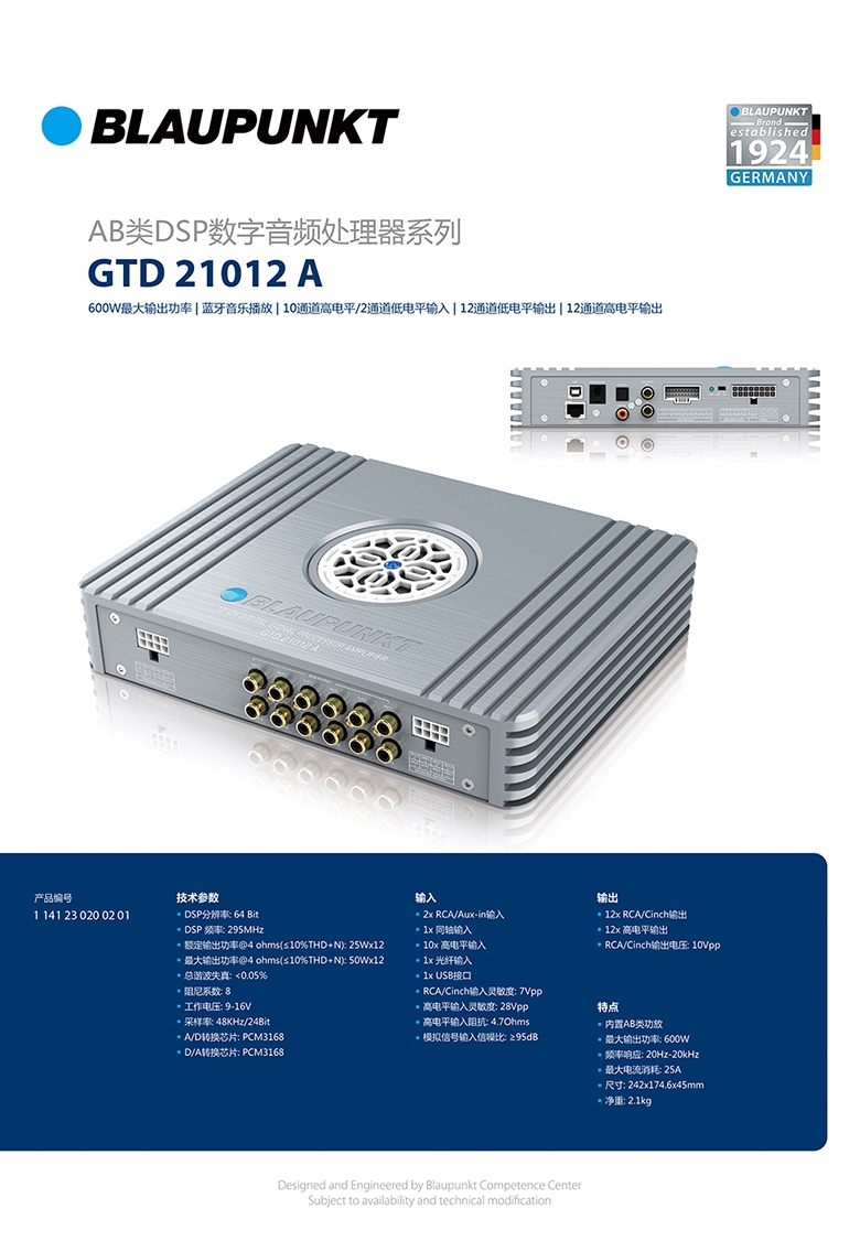 德國藍(lán)寶(BLAUPUNKT)大功率高清12路DSP功放 GTD 21012 A