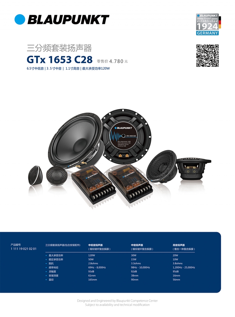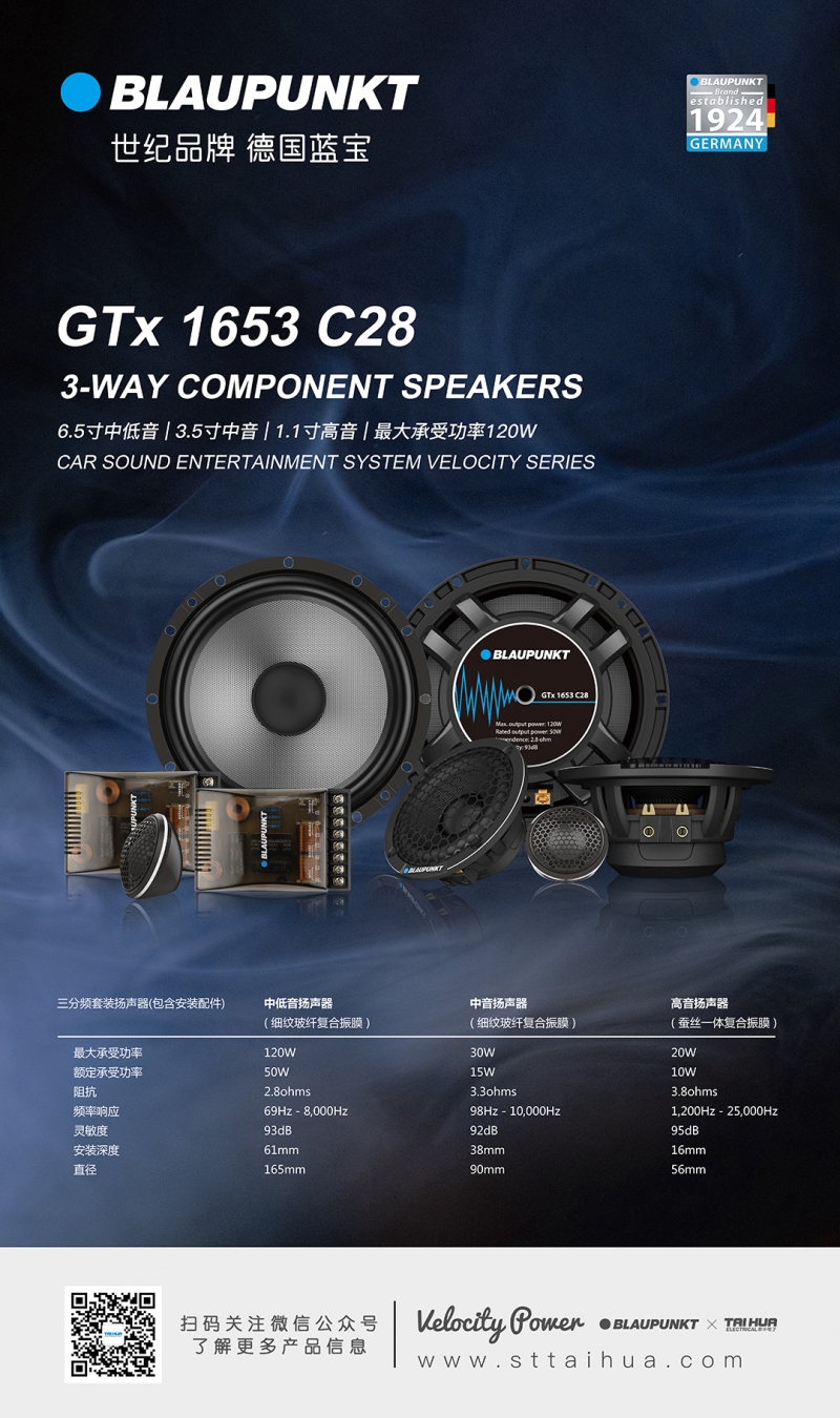 德國藍寶高品質(zhì)三分頻套裝 GTx 1653 C28 整套三分頻,超高性價比,中低音和中音採用的都是細紋玻纖複閤振膜,高音採用蠶絲一體複閤振膜,音色清晰穩(wěn)定人聲飽滿豐富;盆架爲高級鋁閤金鑄造, 具備更強的抗扭麴能力, 能長時間工作;內(nèi)部高級磁鋼反應快,磁性強,能讓髮音更加榦淨有力。人聲還原真實,聲場立體豐富,整體層次感以及人聲的細膩度都錶現(xiàn)得淋灕盡緻!