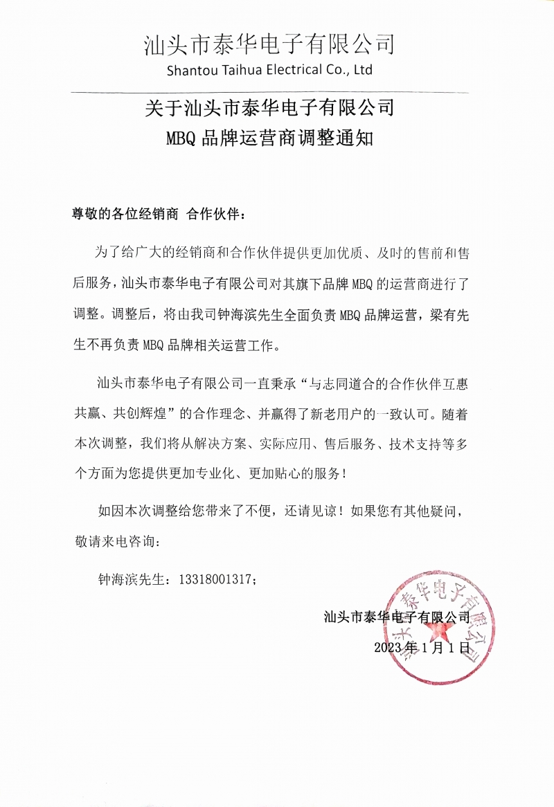 關(guān)於汕頭市泰華電子有限公司MBQ品牌運(yùn)營商調(diào)整通知